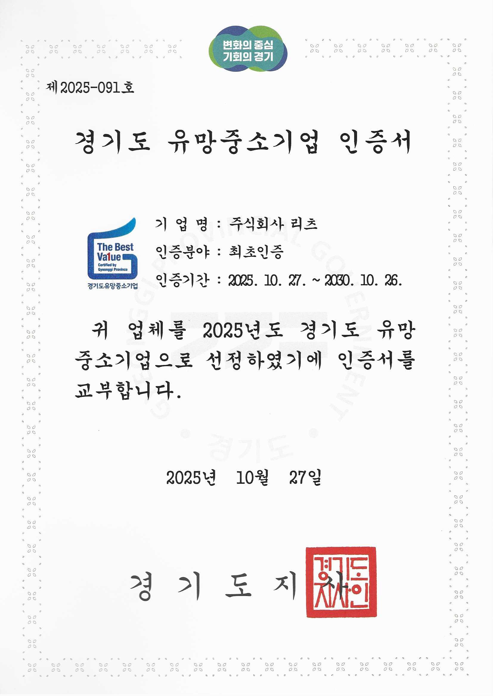 2025 경기도 유망중소기업 인증서